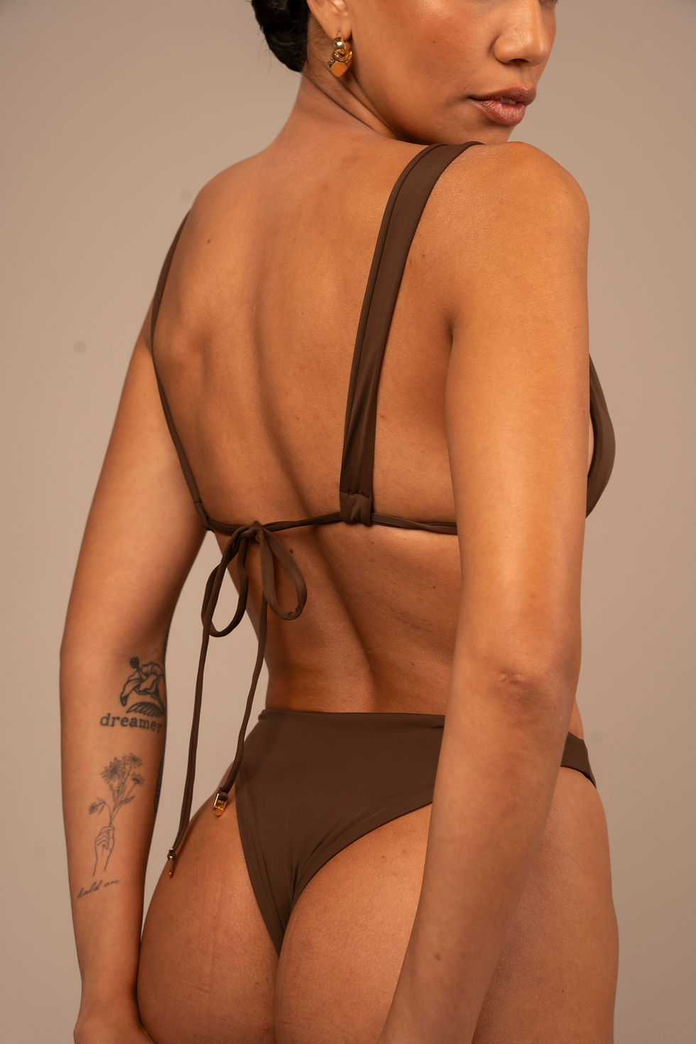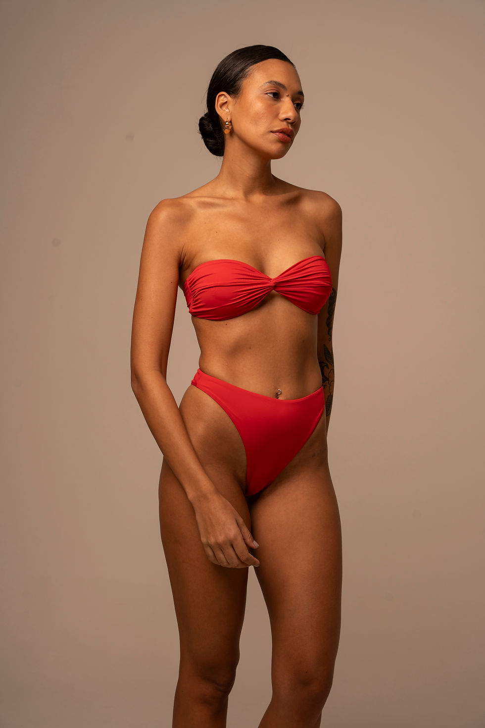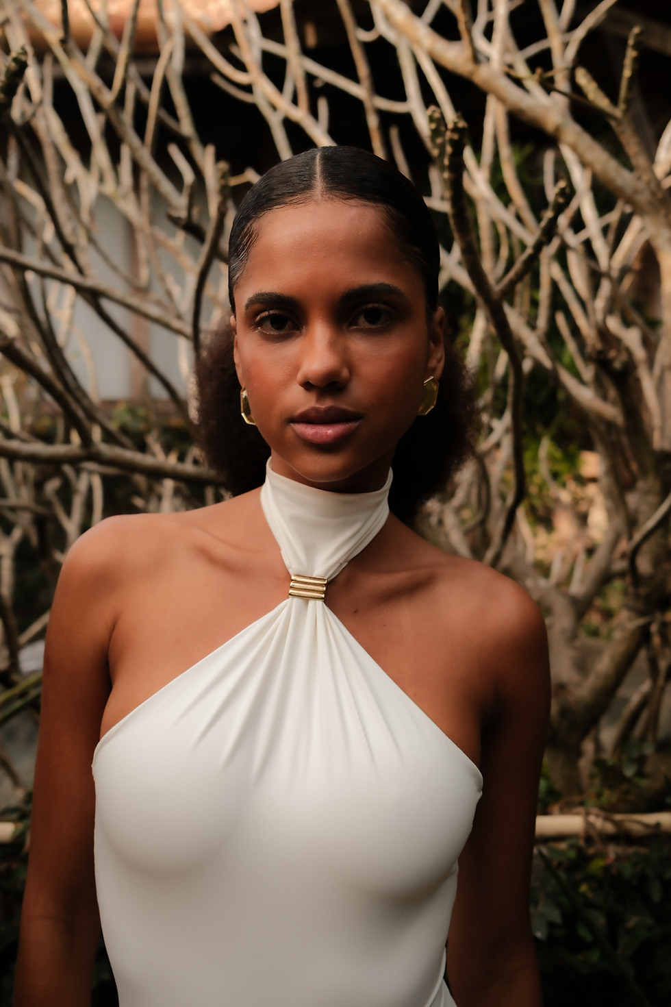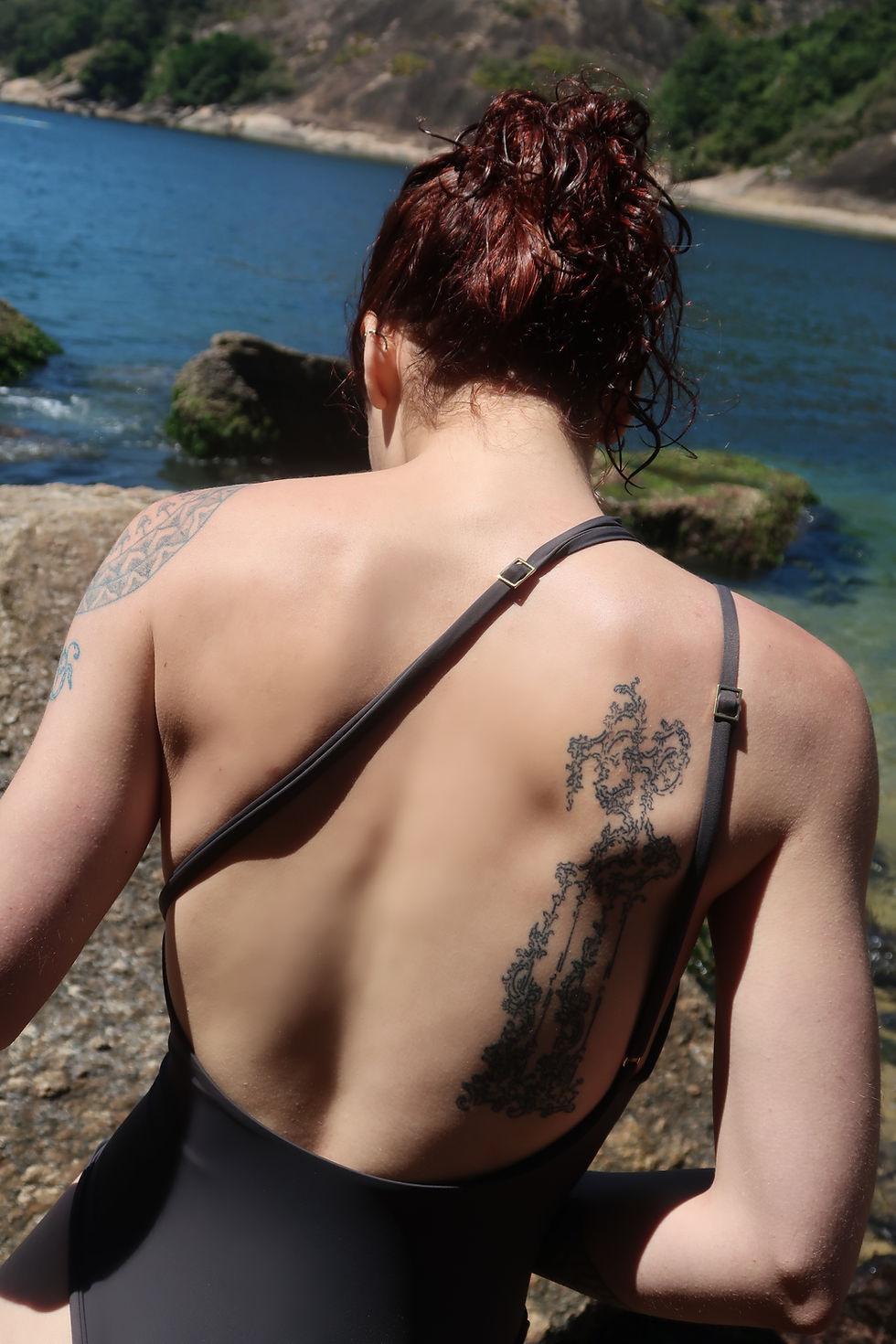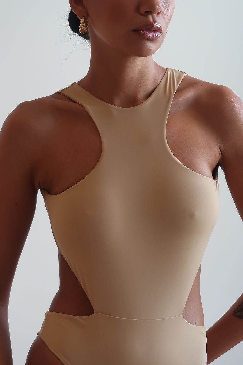 Top sem alça com entrelace na parte frontal, moldando melhor os seios. Costas com fecho banhado à ouro 24k.